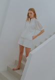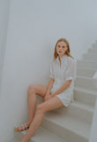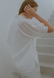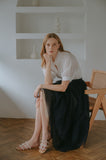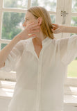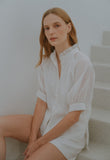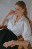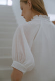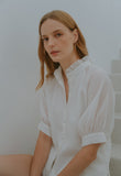 The Pleated Poet Shirt is an enchanting blend of sheer softness in the sleeves and striking collared elegance. Tailored in an unusually textured, airy fabric featuring fabric button closures.