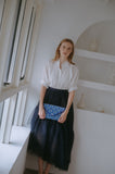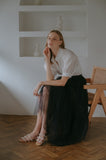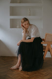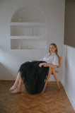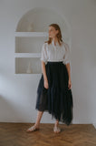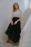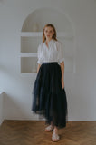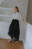 The Tiered Tulle Skirt is cut asymmetric, with tiered layers of frothy tulle fabric. Cinched at the waist, the skirt has a statement, voluminous structure.